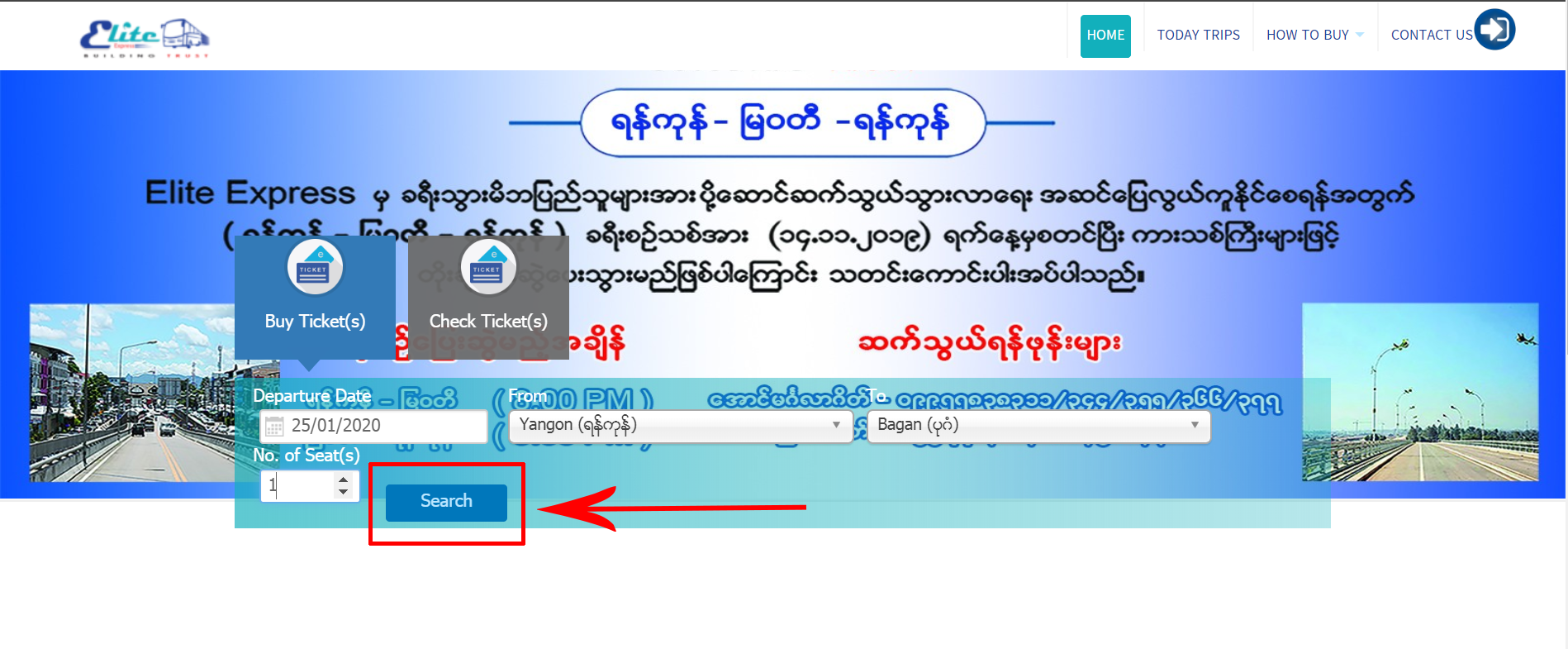 ၁။ Departure Date,From, To, No. of Seat(s) များ ရွေးချယ်ဖြည့်သွင်းပြီး Search ကို နှိပ်ပါ။