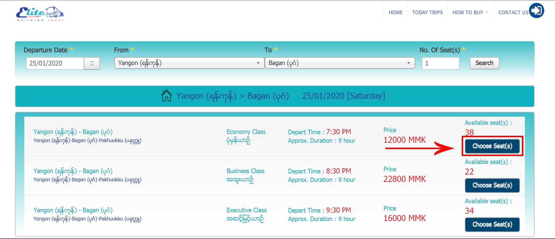 ၂။ လက်မှတ်ဝယ်ယူရန် မိမိသွားရောက်လိုသော ခရီးစဉ်အချိန်ကို ရွေးချယ်ပြီး Choose Seat(s) ကို နှိပ်ပါ။