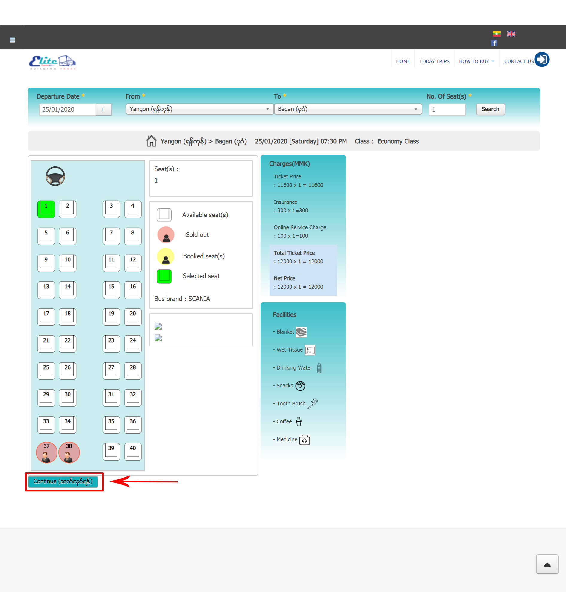 3. You can select desire seat No. from avaliable seats colored with white blocks. Then, click on Continue to continue.