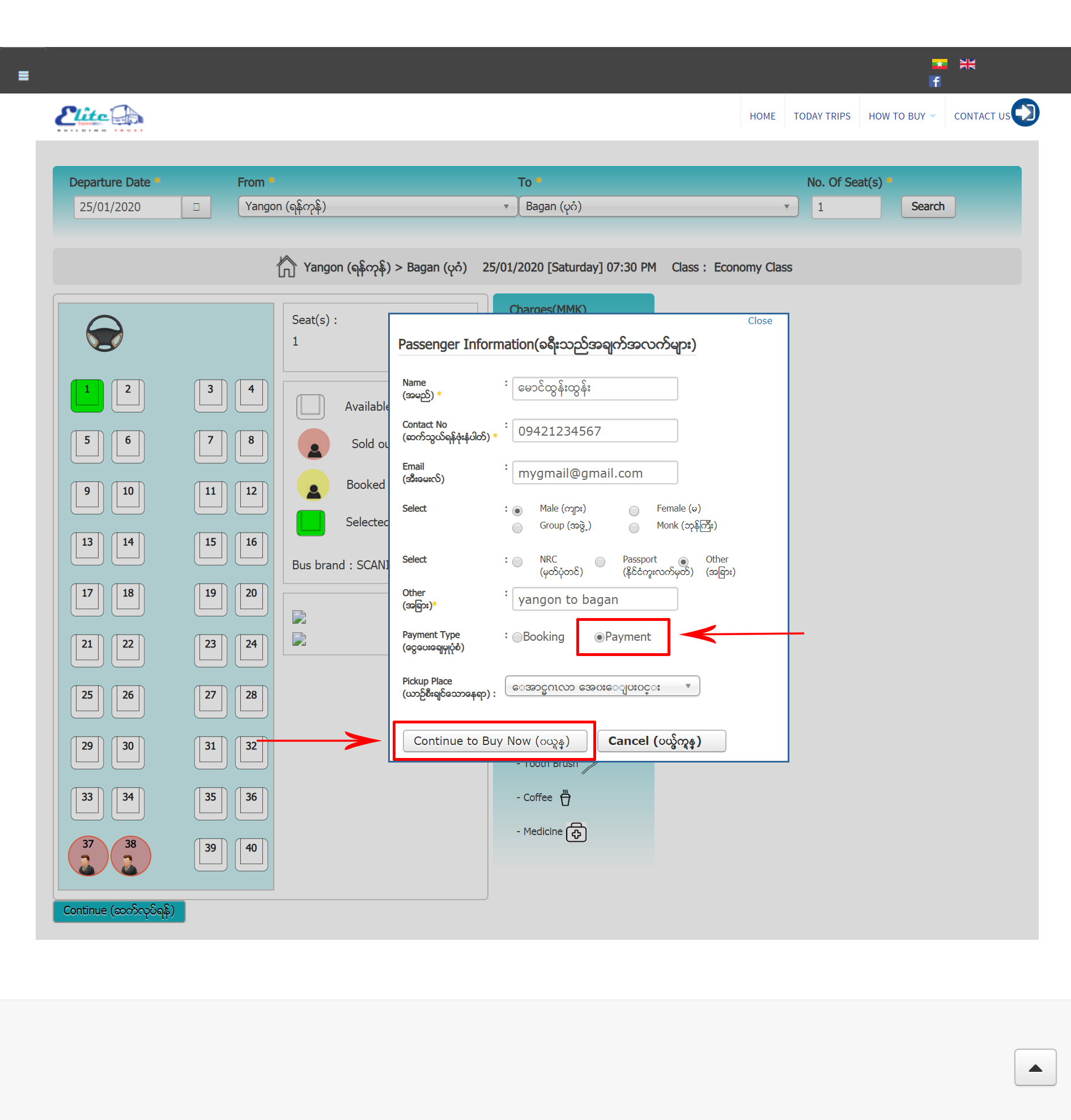 ၄။ ခရီးသည် အချက်အလက်များဖောင်တွင် လိုအပ်သော အချက်အလက်များကို ဖြည့်သွင်းပြီး ငွေပေးချေမှုပုံစံတွင် Payment ကို ရွေးချယ်ပေးရပါမည်။ email သို့ လက်မှတ် ပို့စေလိုပါက မှန်ကန်သော email ကို ဖြည့်သွင်းပါ။ ထိုနောက် Continue to Buy Now ကို နှိပ်ပါ။