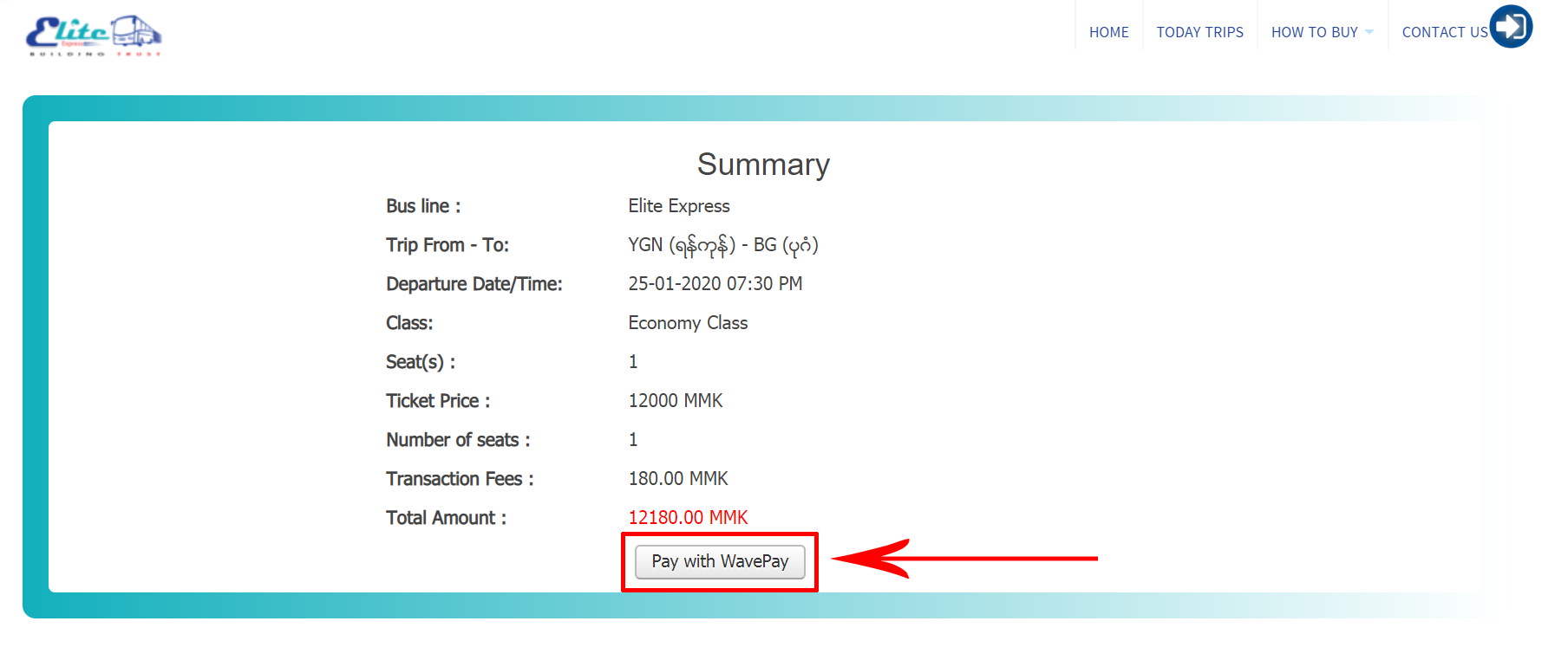 အထက်ပါ အဆင့်များသည် Elite Express Website မှတစ်ဆင့် ဝယ်ယူသူများအတွက်သာ ရည်ရွယ်ပါသည်။ Website အား အသုံးမပြုပဲ Wavepay application မှလည်း Elite ကားလက်မှတ်များအား တိုက်ရိုက် ဝယ်ယူရရှိနိုင်ပါသည်။