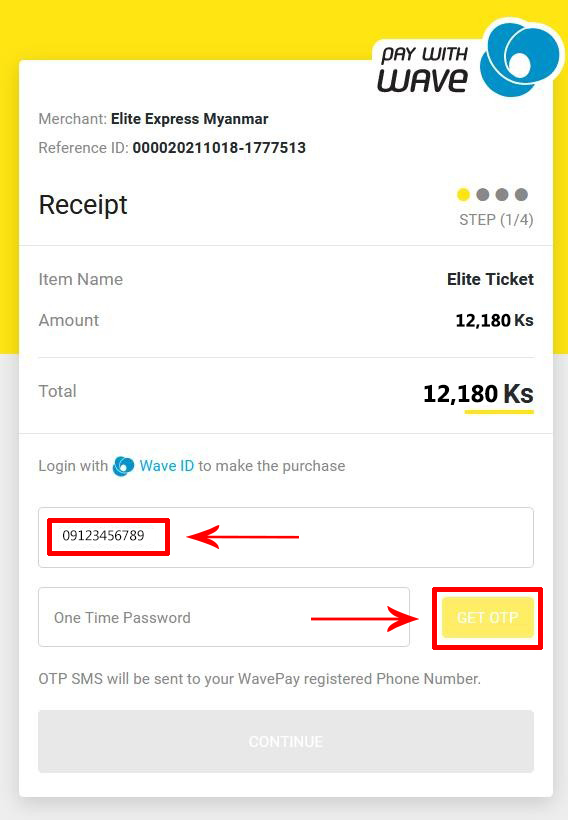 7. Enter your wavepay account phone number and click on 'GET OTP'. Wavepay will send 6 digits OTP code to your mobile.