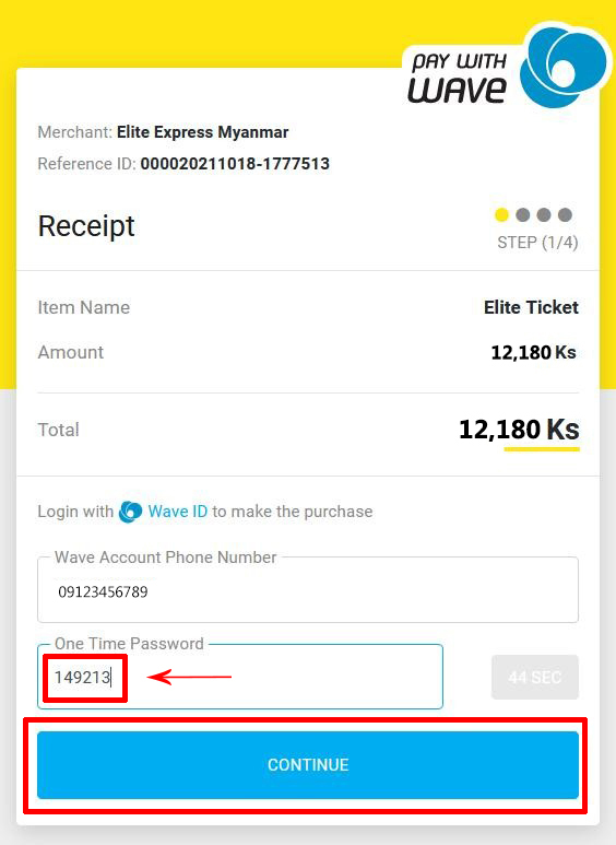 ၈။ ဖုန်းထဲသို့ ရောက်ရှိလာသည့် ဂဏန်း ၆ လုံးအား One Time Password ထဲသို့ ရိုက်ထည့်ပြီး 'CONTINUE' နှိပ်ပေးပါ။