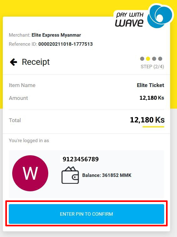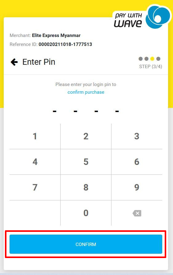 ၁၀။ မိမိ၏ Wavepay account pin နံပါတ် ခေါ် password ဂဏန်း ၄ လုံးအား ရိုက်ထည့်ပြီး 'CONFIRM' နှိပ်ပေးပါ။