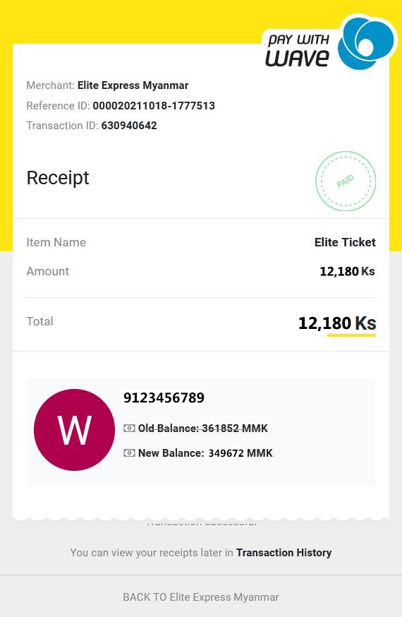 ၁၁။ နောက်ဆုံးအနေဖြင့် Wavepay ၏ လက်မှတ်ဝယ်ယူပြီးကြောင်း ဘောင်ချာကို လက်ခံ ရရှိမည်ဖြစ်သည်။ ထို့နောက် Elite Express ဝက်ဘ်ဆိုက်သို့ ပြန်လည် ပို့ဆောင်ပေးမည်ဖြစ်ကာ ကားလက်မှတ်အား လက်ခံရရှိမည်ဖြစ်ပါသည်။